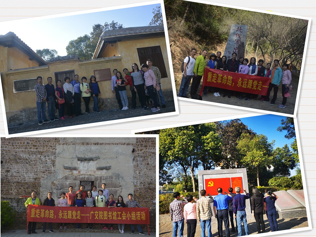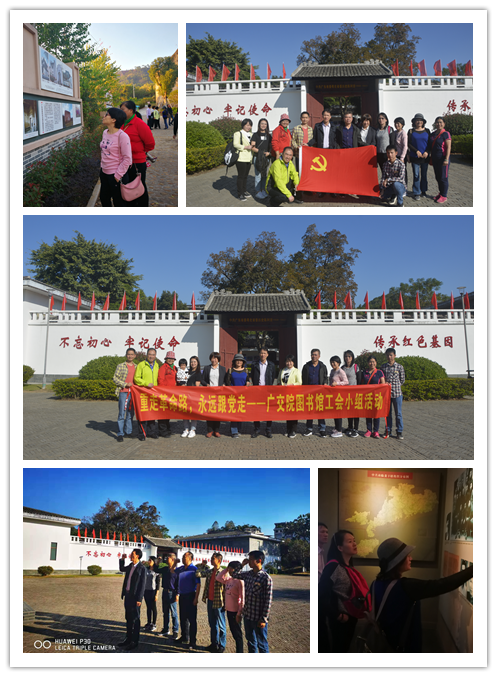 深秋时节,在庆祝我们伟大的祖国70华诞的日子里,学院图书馆工会小组、图书馆党支部举办了以“重走革命路,永远跟党走”为主题的学习实践活动,在11月23日、24日两天的主题教育学习中,老师们走进粤北革命教育基地,重温革命历史,加强党性教育与爱国主义教育,坚定永远跟党走的信念与信心。