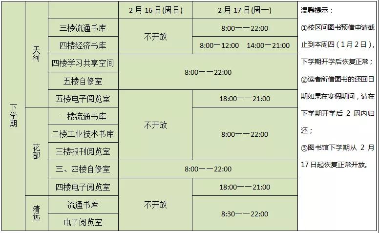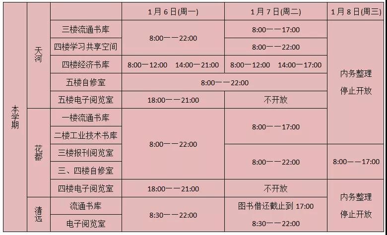 按学校校历安排,为方便读者的阅读需求,现将本学期末及下学期初开放通知如下: