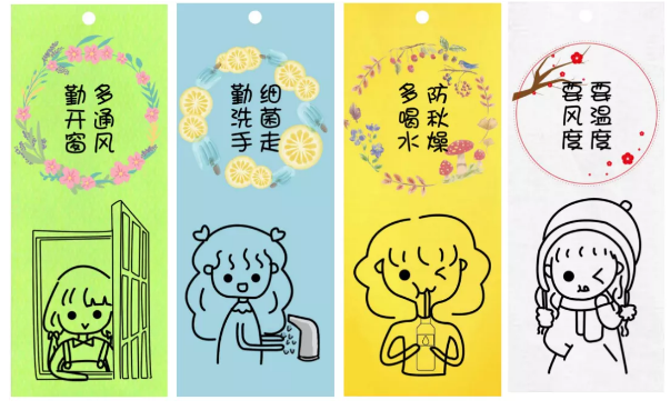 冬的作品使用了白色作为底色,腊梅为圆环,代表着冬季。冬天寒冷,稍有不慎就会着凉。有些女孩子可能爱美就少穿衣服,从而病了。我们应该要风度的前提也要“温度”。