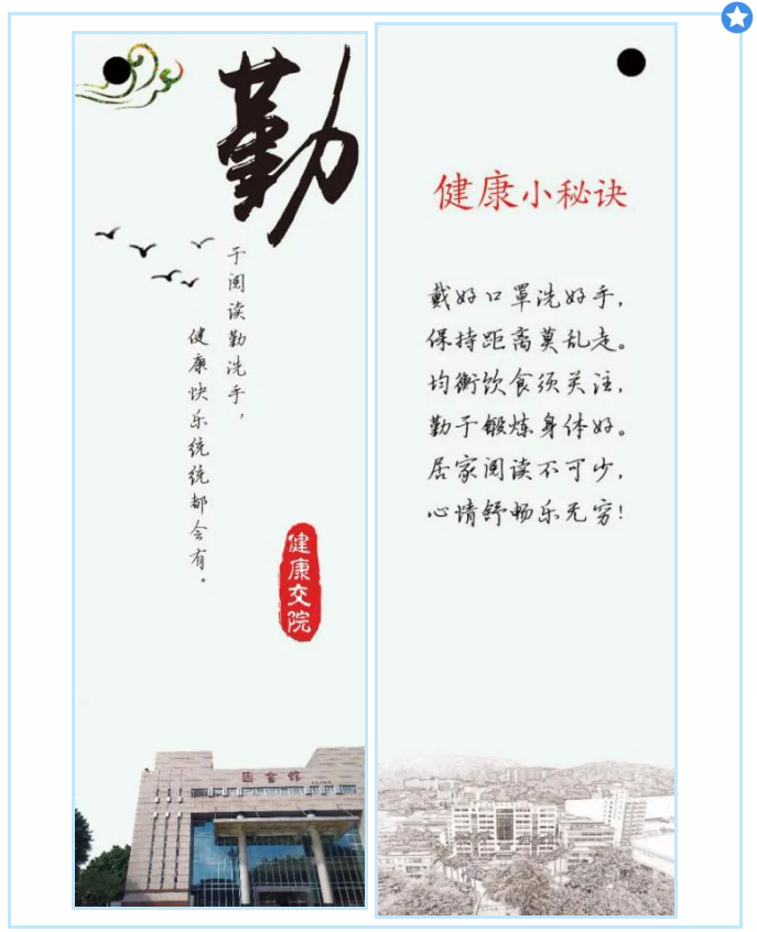 2020年“书签设计大赛”圆满结束!此次比赛共有439名同学参加,收到有效作品331份。他们用书签向人们宣传卫生常识,用书签展现阅读的美好与重要。经过图书馆评委老师们的认真评审,本次比赛获奖作品名单已经出炉。