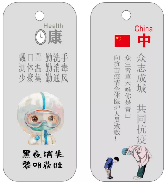 作品陈述:书签主题是“武汉保卫战”,以普及健康小知识为辅,表达对此次战胜疫情的信心以及对医护人员的感激之情为主。抗击疫情需要全国上下同心,书签的正面是防疫健康小知识,只有全国人民心连心,自觉做好相关防疫措施,我们才能战胜病毒,“黑夜消失,黎明终会胜利”;背面通过一个小男孩向医护人员鞠躬的背景图,致敬白衣天使为此次疫情抗击做出的贡献。这样的付出与牺牲,大家应该永远铭记。