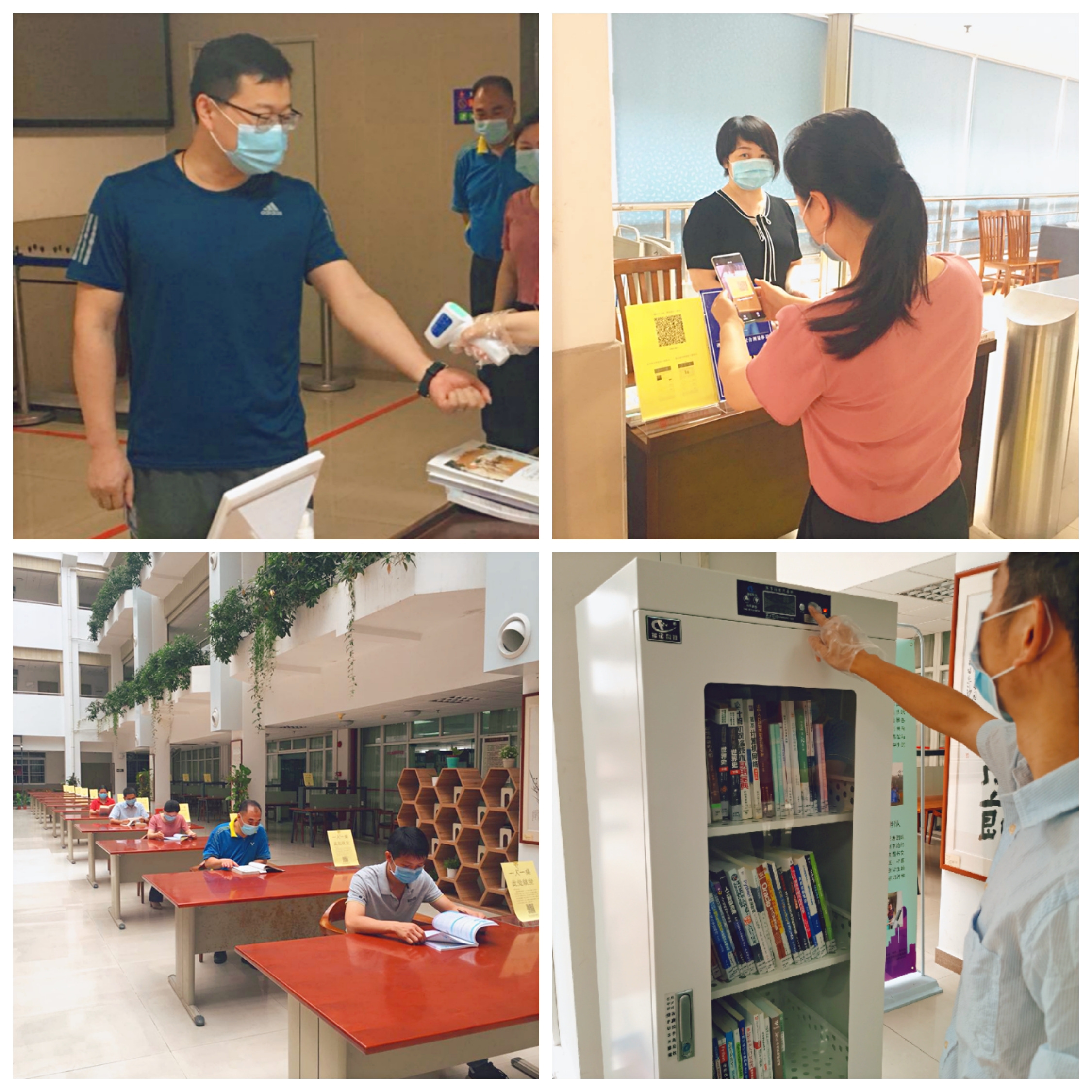 为做好疫情防控期间开放服务的准备工作,图书馆已制定了疫情分级防控和开放服务方案、应急处置工作指引,策划部署了线上预约借书、预约入馆、线上咨询等多种服务方式。同时,在馆舍内,通过“制度上墙”,“地面指引”,“桌面提醒”等方式提醒读者筑牢防疫安全线,遵守公共场合佩戴口罩,与人间距1.5米以上,就座时一人一桌等防疫规定。