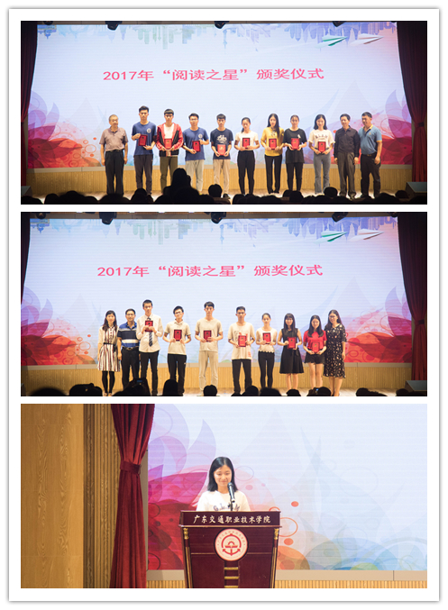 开幕式上,还表彰了2017年度15名学生“阅读之星”。16汽车电子技术(1)班的莫燕飞同学作为“阅读之星”代表发言,与大家分享了自己的阅读心得与感悟。