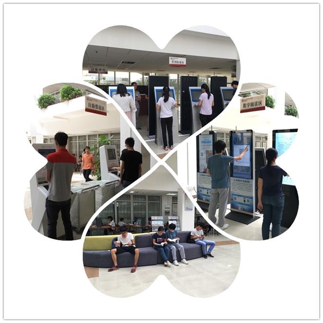 图书馆引进RFID射频识别技术和智能馆藏管理系统实现了读者借还书籍的自动化服务,使读者的阅读活动更具选择性、自主性。在图书馆三楼、四楼共放置了三台白色的“自助借还书机”,读者只需持有校园一卡通,即可在机器上实现全自助式查询书目、借书、还书、续借等功能。