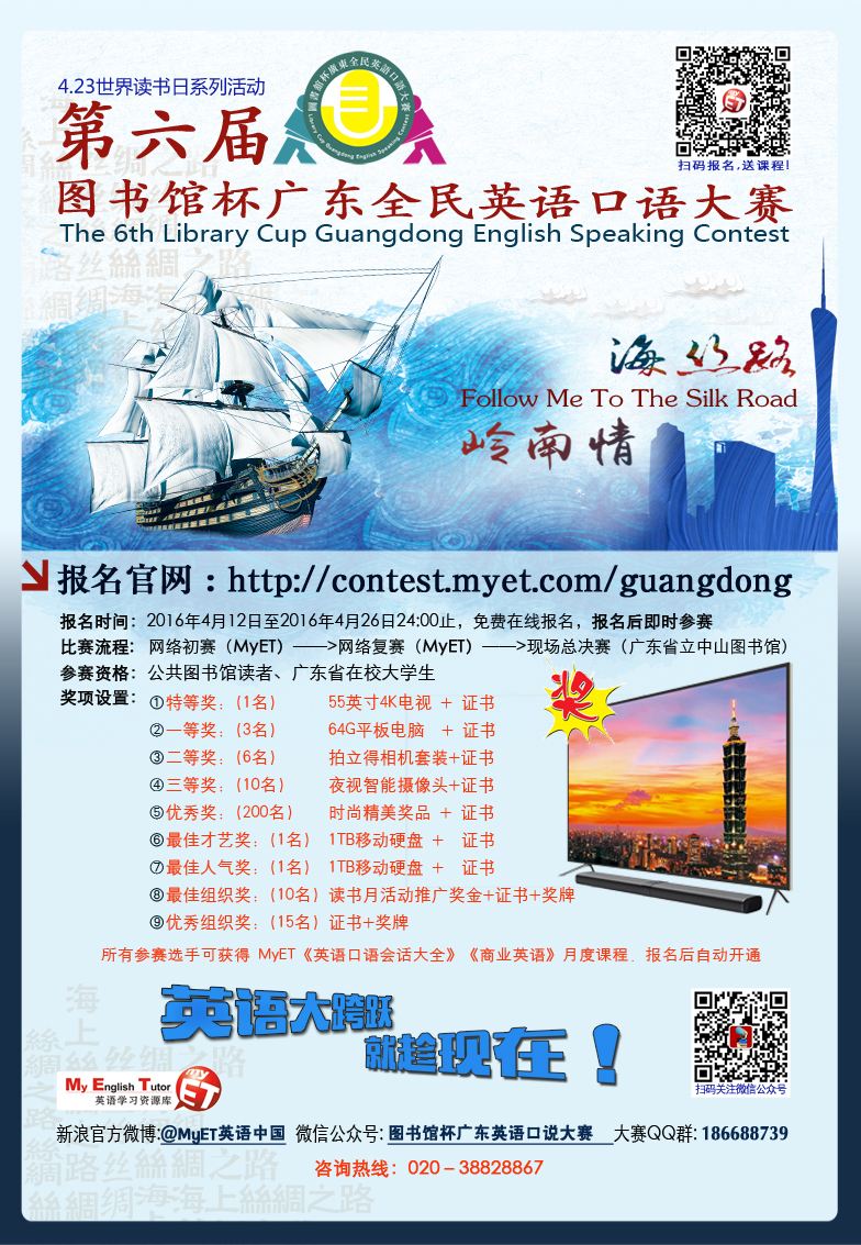 为迎接“4.23”世界读书日,倡导并组织开展全民阅读工作,不断创新方式推广阅读,加强全民阅读宣传服务,更好地致力于图书馆文化建设,发挥图书馆社会教育功能,促进读者之间基于英语学习的交流和竞技,提高读者英语应用的能力,特举办第六届『图书馆杯广东全民英语口语大赛』,通知如下: