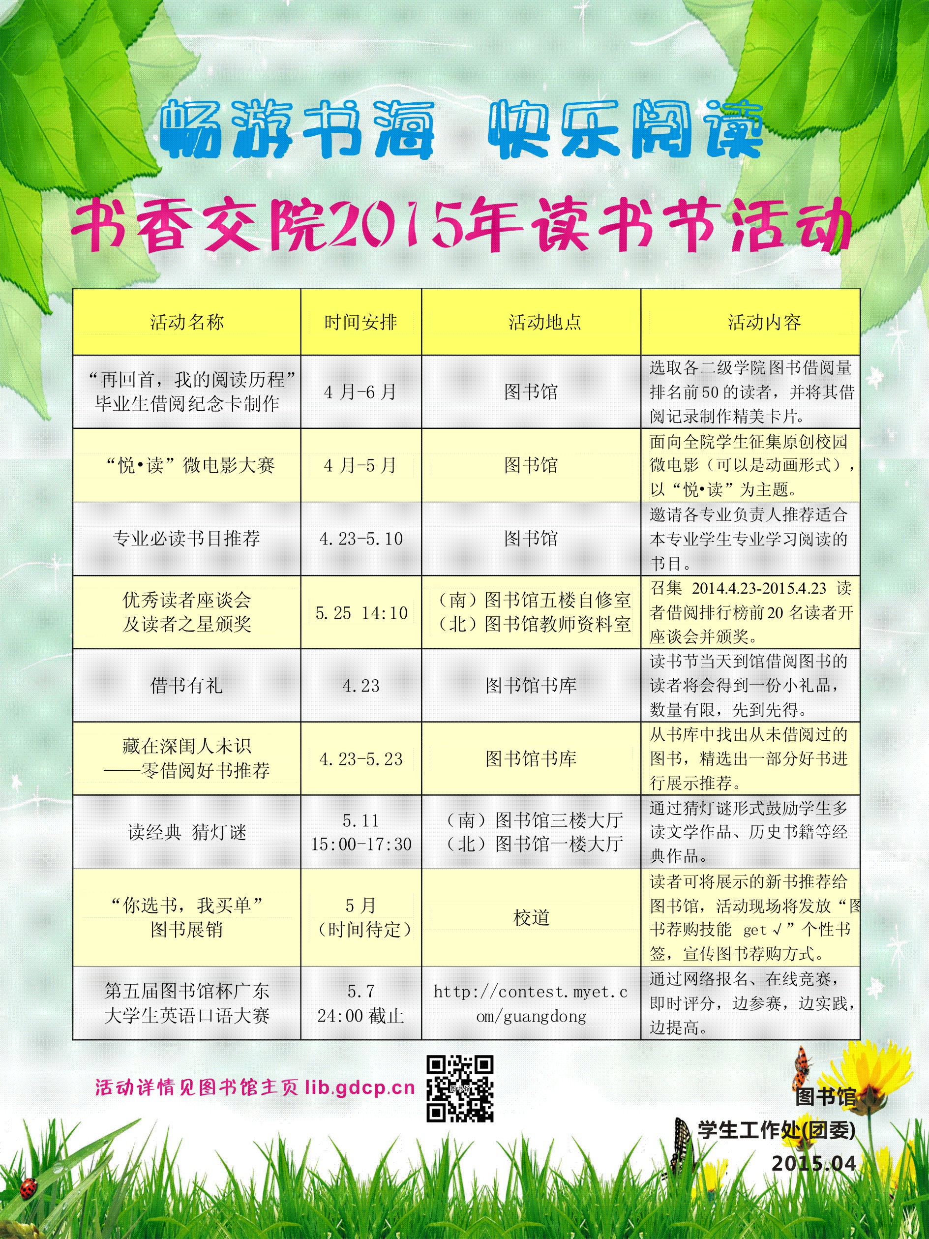 随后,图书馆还将继续推出一系列丰富多彩的活动,其中包括为学生喜闻乐见的“悦·读”微电影大赛、“广东大学生英语口语大赛”等,力争扩展学生视野,增强学生思辨能力与动手能力;还包括紧跟专业设置的专业必读书目推荐活动,届时将邀请学院专业负责老师推荐适合专业学习阅读的书目,以指导学生完善知识结构,使他们专业知识的阅读和学习有比较科学、系统的规划;专为2015届毕业生推出“再回首,我的阅读历程”活动,旨在为即将告别校园的莘莘学子多添一份母校记忆。图书馆将为在校期间借阅量排名在前的毕业生整理、打印借阅记录,并制作精美卡片赠送给毕业生。于此,广交学子将带着浓浓的母校情,深深的祝福声,放飞梦想,踏上新征程;此外,还包括“读经典猜灯谜”、“藏在深闺人未识”零借阅好书推荐等一系列趣味活动。图书馆希冀通过形式多样、主题鲜明、互动趣味的各类精彩活动,让广交院学子在知识的海洋中畅游,去体验阅读所带来的快乐。